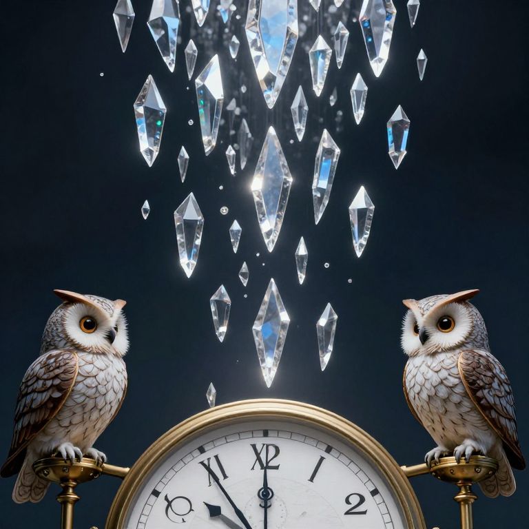 Photograph of two realistic owls perched on golden clock arms, facing each other against a dark blue background. Above them, a cascade of sparkling, faceted crystals adds a magical effect. The clock has a white face with black Roman numerals and black hands. The owls have brown and white feathers, with large, expressive yellow eyes. The image combines realistic elements with a whimsical, fairy-tale-like atmosphere. The crystals' reflections create a dazzling light show.