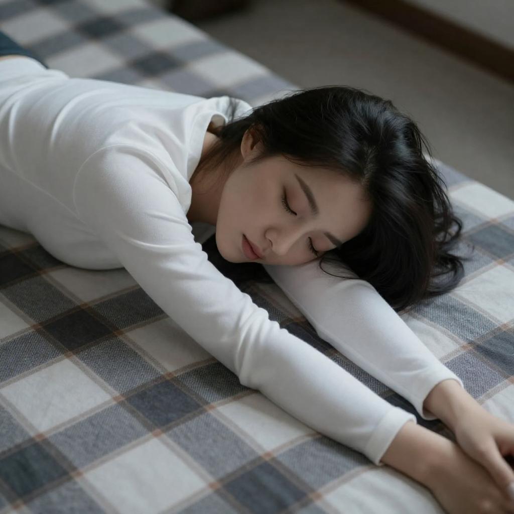 Young Asian woman lying on a bed with her shoulders and back of her head resting on the mattress, legs raised and knees bent close to her chest. She wears a yellow sweater with a heart-shaped cutout, a sky blue skirt, slouch socks, and white platform boots. The setting is a minimalist bedroom with neutral tones and a wooden headboard.