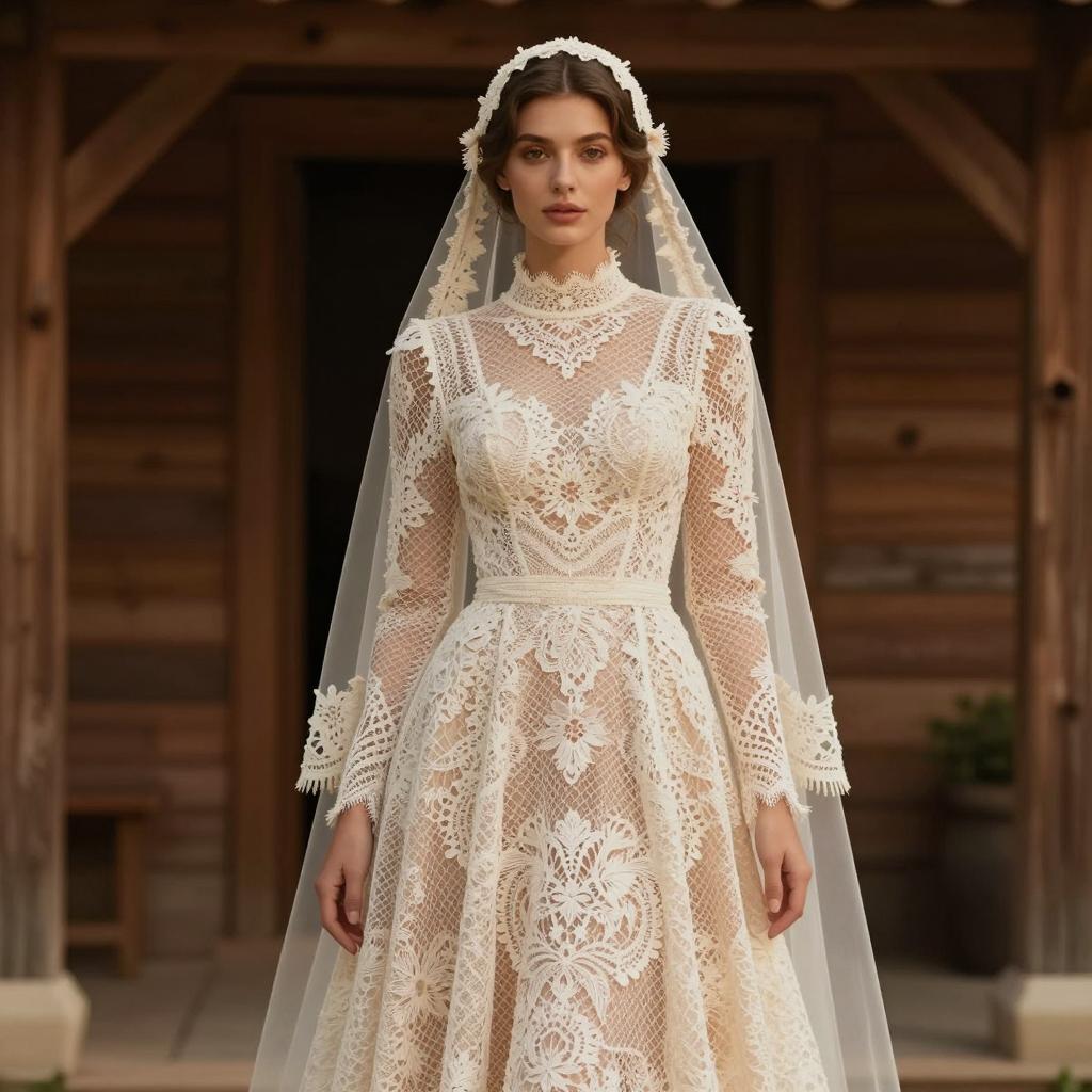 Photorealistic portrait of a young woman with brown hair wearing a detailed, long-sleeved ivory lace wedding dress with a high neckline and full-length skirt. She wears a matching lace veil and stands in front of a rustic wooden building. The image features warm natural light, soft shadows, and a romantic vintage style emphasizing the intricate lace patterns and serene expression of the bride.