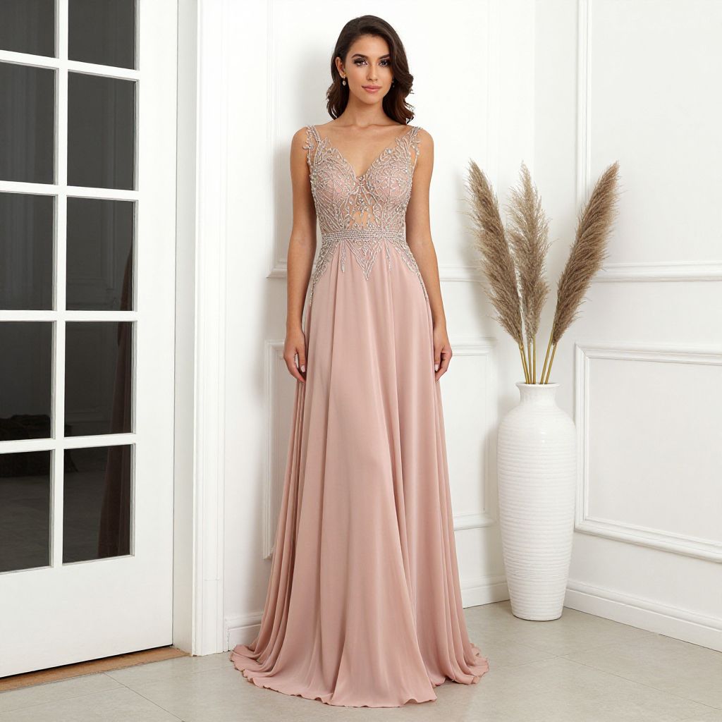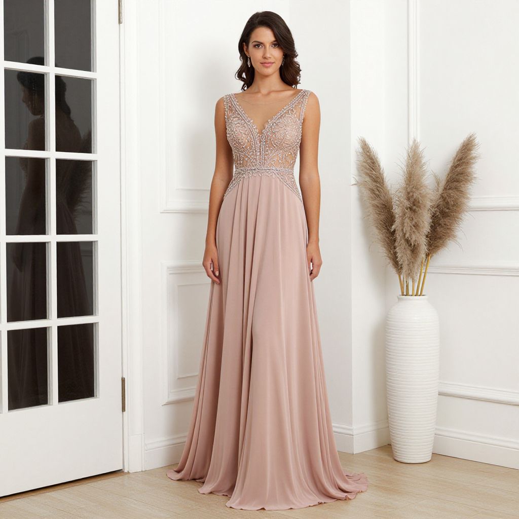 Photograph of a woman with fair skin and dark brown, wavy hair standing in a bright, white-walled room. She wears a floor-length, blush pink evening gown with a deep V-neck and intricate, sparkling lace bodice. The gown has a flowing, elegant skirt. To her right, there is a tall, white ceramic vase filled with pampas grass. A white-framed glass door is on the left, allowing some light to filter in. The woman's makeup is subtle, and she has a confident, calm expression. The floor is light gray.