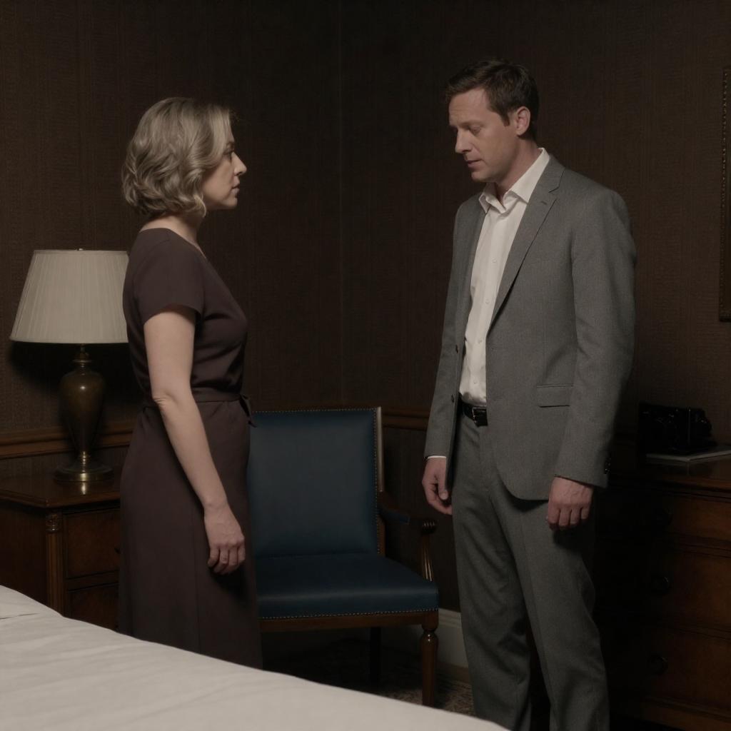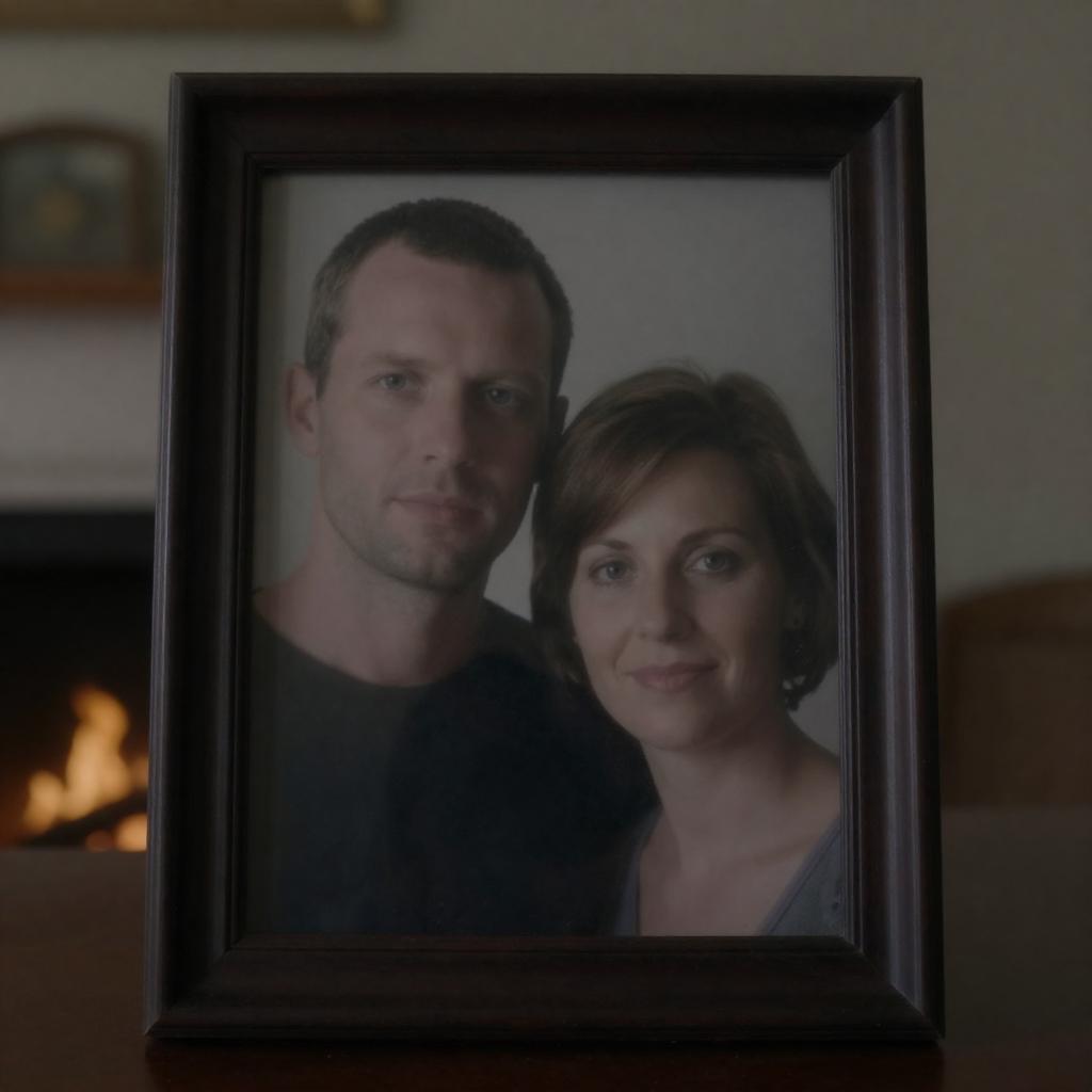 Photograph of a dimly lit room with a framed picture of a man and woman. Man with short hair, fair skin, and neutral expression. Woman with short brown hair, fair skin, and slightly smiling. Background includes a lit fireplace with wooden mantel. Both closely positioned in the frame. Frame has a dark, ured border. Low light creates shadows.