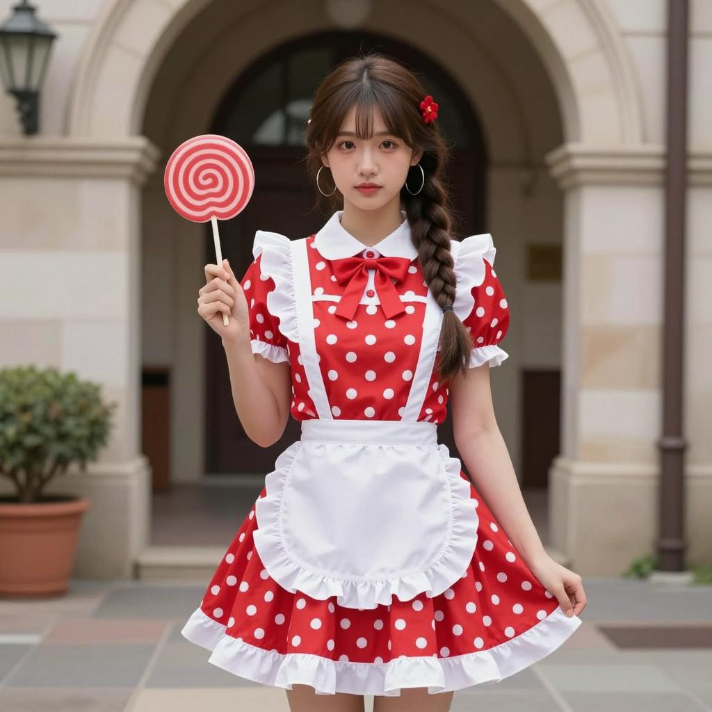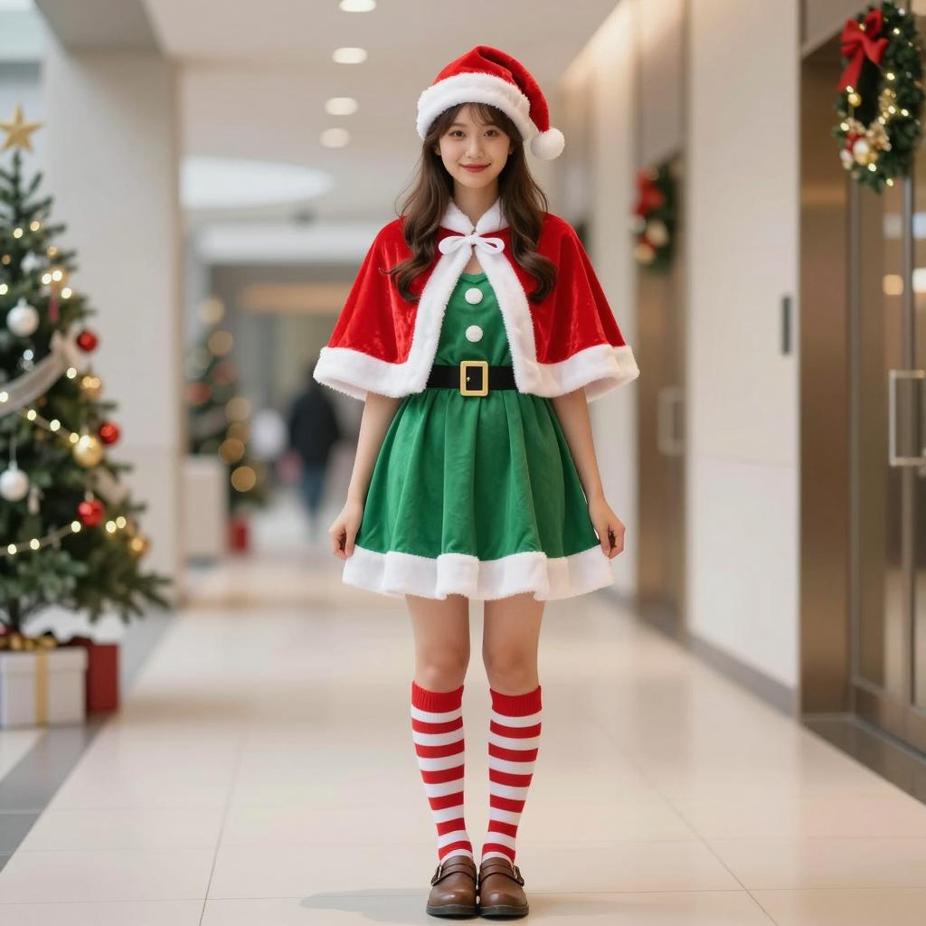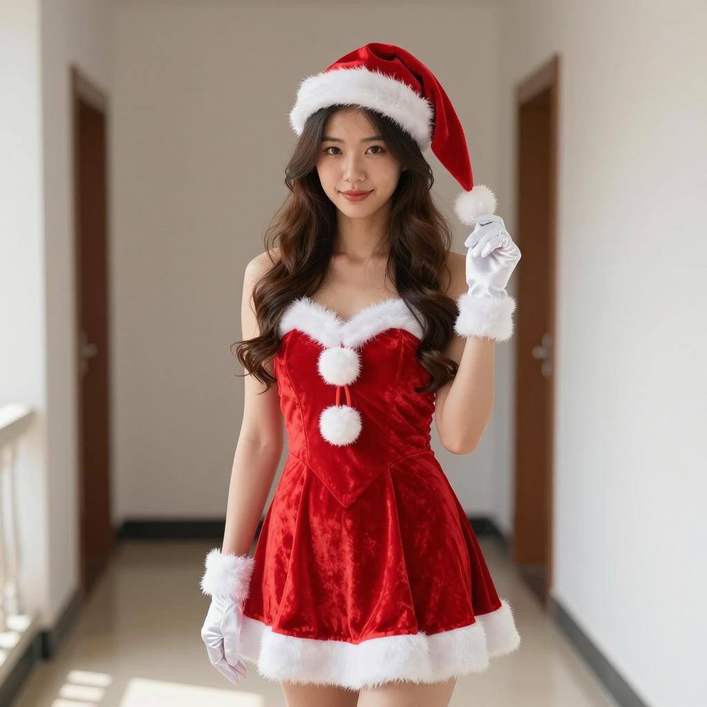 Young Asian woman standing confidently on a sunny street wearing a festive Christmas costume. The outfit consists of a red dress with white frills, a green ribbon bow on the chest, and a red bow headband. She has long brown braided hair and is photographed during daytime with blurred trees, lampposts, and houses in the background.