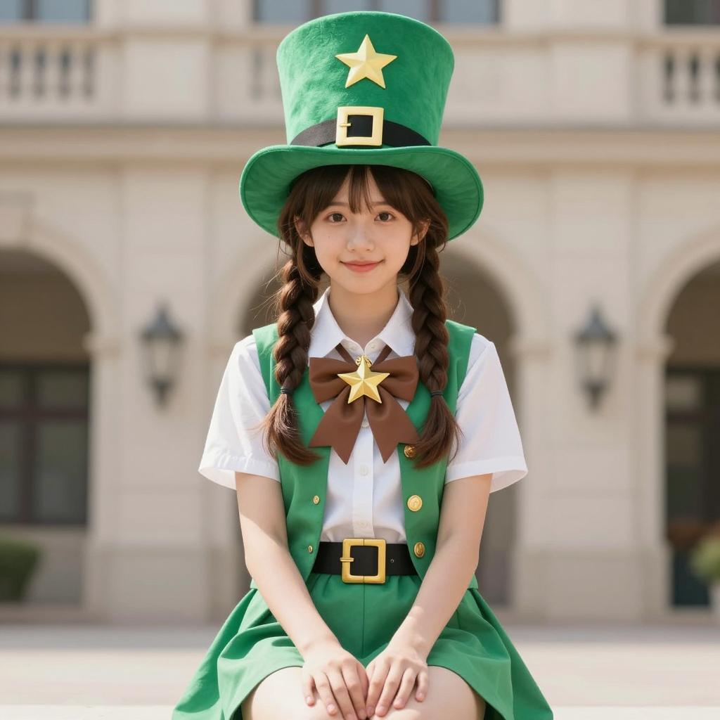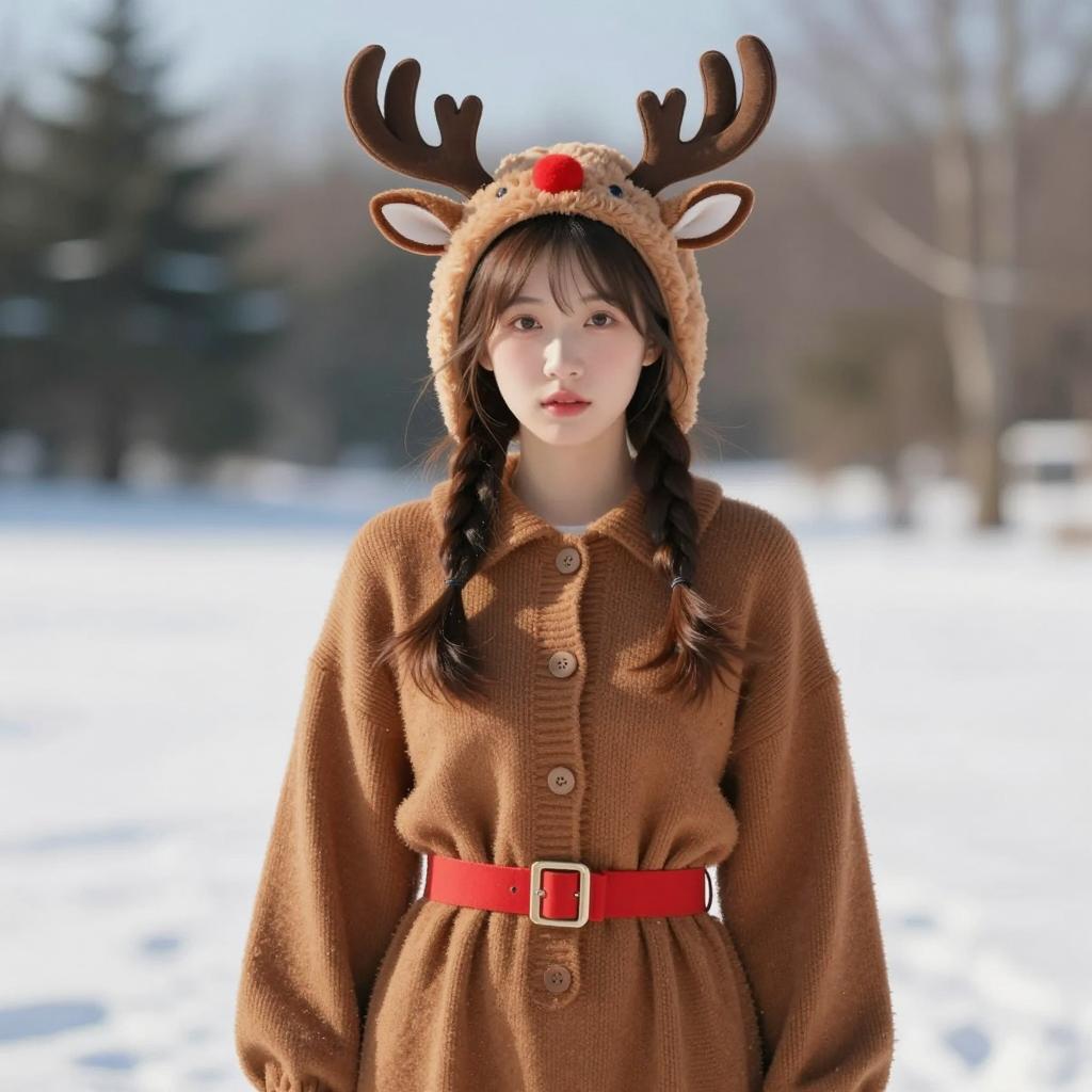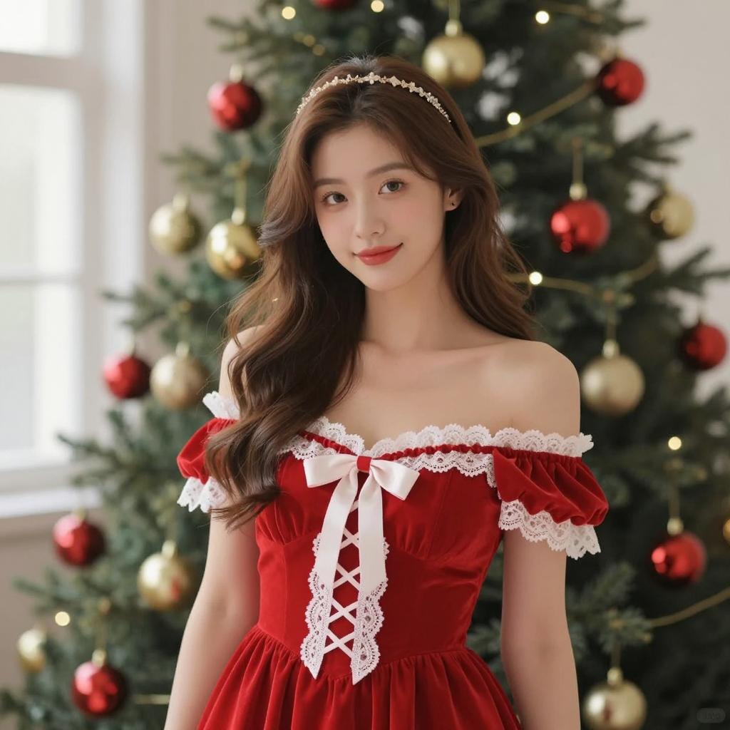 Girl christmas fancy dress, photorealistic, young Asian girl, Christmas costume, red dress with white frills, green ribbon, red bow on head, long brown braids, standing on sunny street, blurred trees and lampposts in background, daytime, clear sky, confident expression, realistic lighting, detailed ures, festive outfit