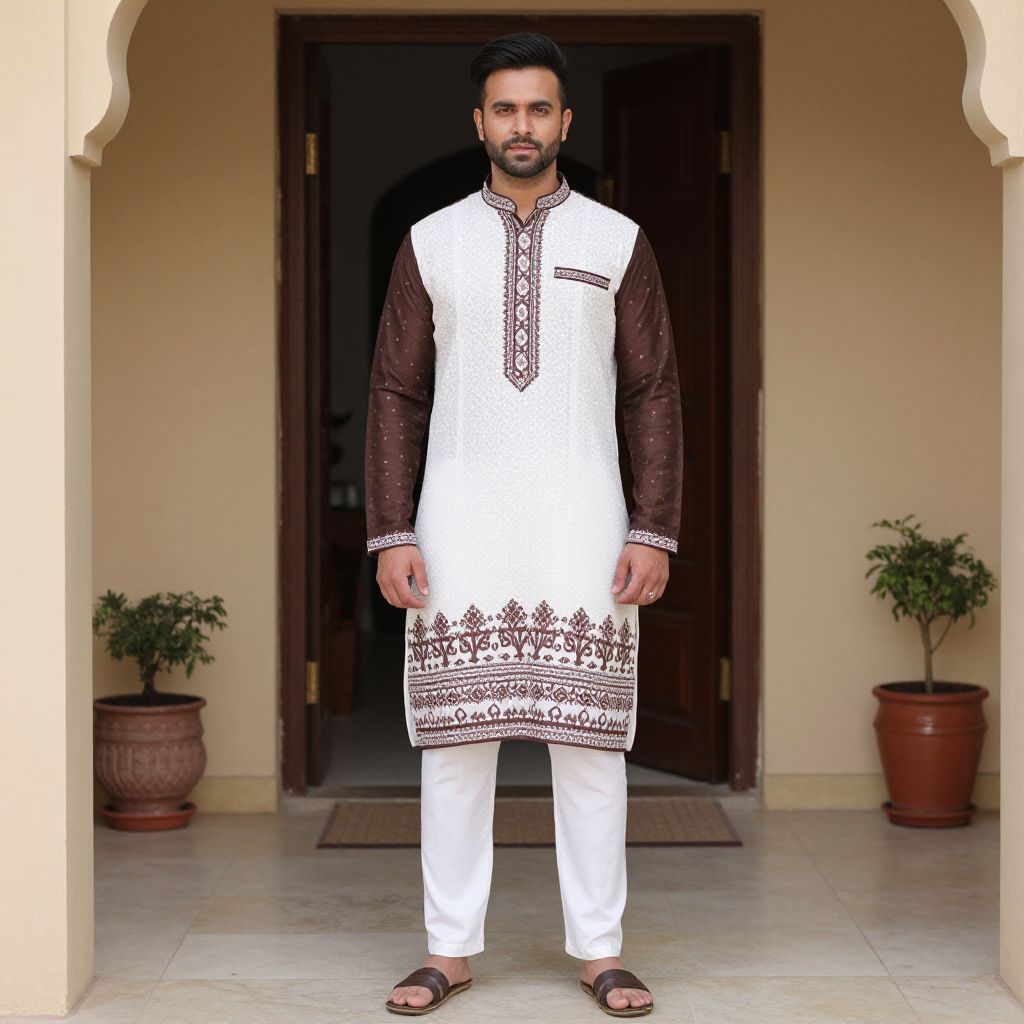 Kurta Designs Costume, a man in a brown and white kurta stands in front of a doorway