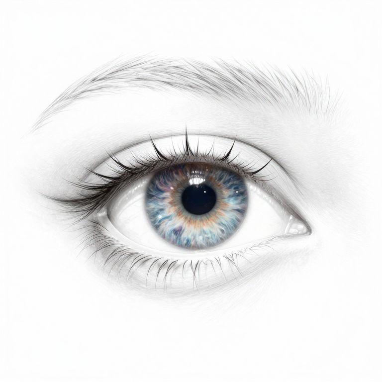 Close-up digital illustration of a blue-eyed human eye with detailed iris, black eyelashes, and fine eyebrow hairs against a white background.