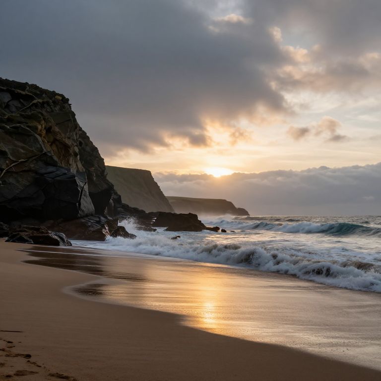 Photograph of a dramatic beach sunset. Dark, rocky cliffs dominate the left side, with waves crashing against them. The wet sand in the foreground reflects the golden light from the partially obscured sun, which is breaking through the clouds on the right. The sky is a mix of dark gray clouds and bright orange and yellow hues from the setting sun. The ocean waves are white and frothy, with the sunlight creating a shimmering path across the water. The overall mood is moody and atmospheric, with contrasting dark and bright elements.