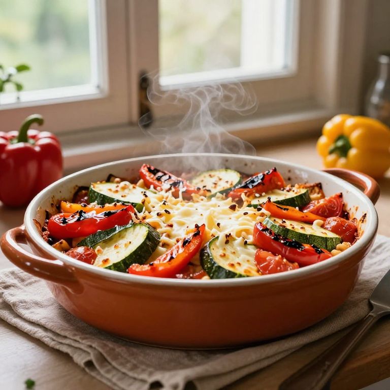 Vegetarian casserole in a farmhouse kitchen, vibrant colors of roasted bell peppers, zucchini, and tomatoes layered with cheese, rustic ceramic dish with steam rising, natural light pouring through windows, cozy and inviting cooking scene.