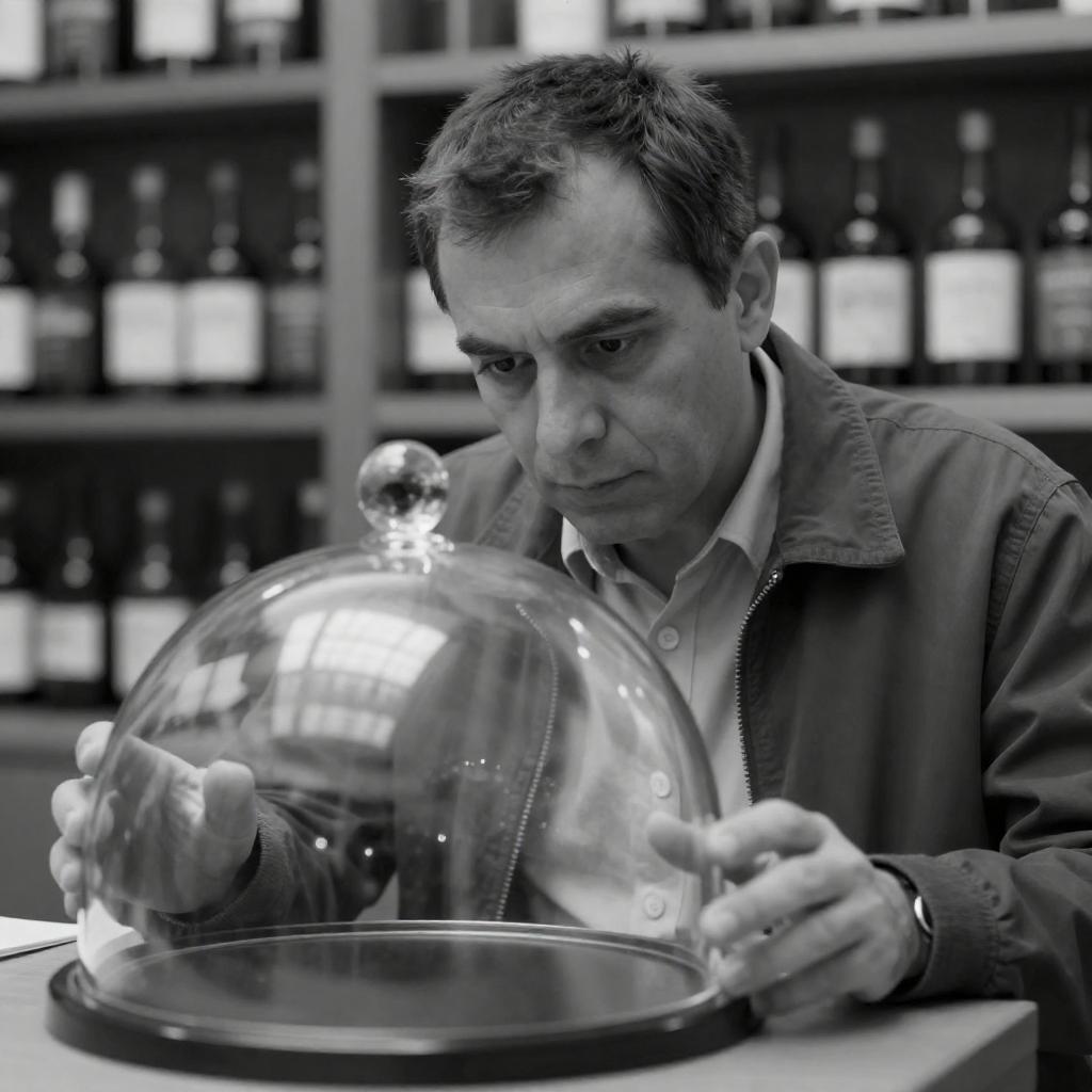 Black-and-white photograph of a middle-aged man with wavy, dark hair, wearing a dark suit and white shirt, intently examining a glass scientific apparatus on a wooden table. Blurred shelves with bottles are in the background. His focused expression and slightly furrowed brows suggest concentration.