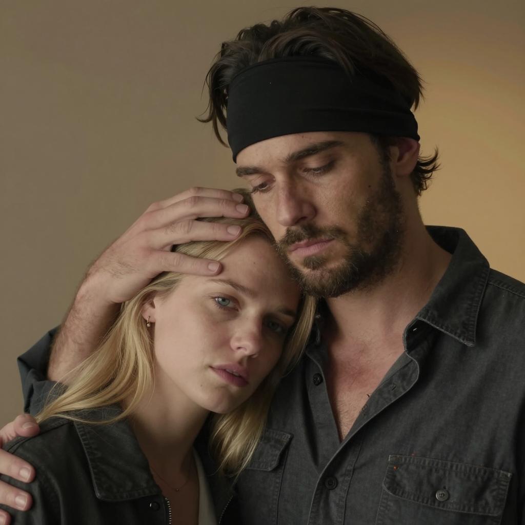 A man and woman. The man with dark hair, beard, and black headband holds the woman's head gently with his right hand. The woman has blonde hair, blue eyes, and fair skin, leaning her head against his shoulder. She wears a dark jacket, and he has a partially unbuttoned dark shirt. Brown and yellow background. The man's expression is serious, the woman's is slightly concerned. Both have their eyes partially closed. The man's left arm is around the woman. Two people.