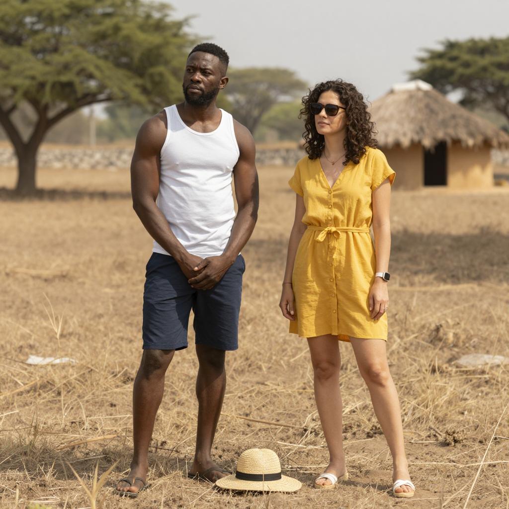 Two people standing in a dry, grassy field. A muscular Black man with short hair, wearing a white tank top and dark blue shorts, stands to the left with hands clasped. A white woman with curly hair and sunglasses, wearing a yellow dress with a belt, stands to the right. Both are looking slightly to the left. A straw hat is on the ground between them. Background includes trees, a thatched hut, and a stone wall. Bright sunlight.