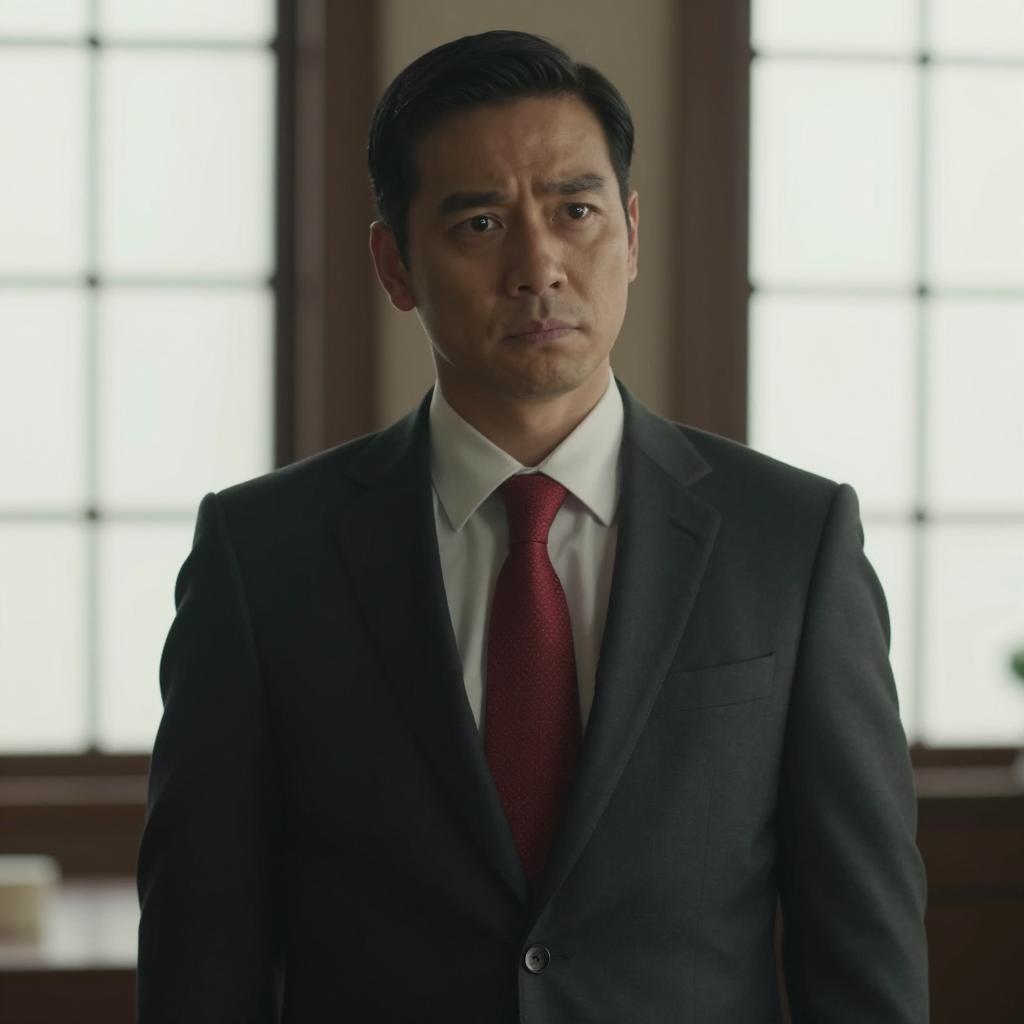 A man in a dark pinstripe suit, white shirt, and red patterned tie. He holds a sharp-edged paper in his right hand, positioned near his face. Background is a ured dark red. Man's face is in partial shadow, with a focused, serious expression. His dark hair is neatly combed. The paper has a reflective light spot near the edge. Man is positioned on the right, paper on the left.