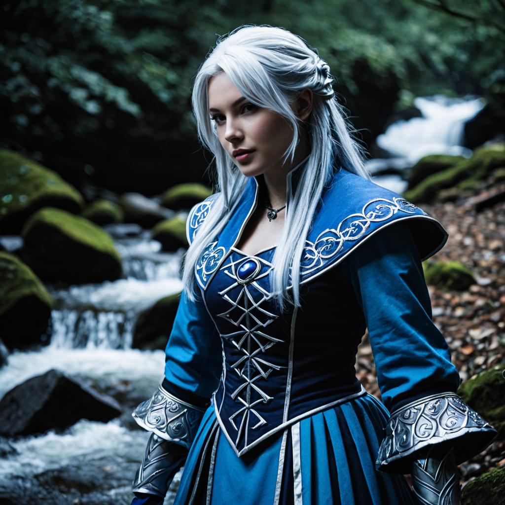 Brook, cosplay costume with silver hair cascading down and a blue detailed outfit, dramatic lighting, depth of field
