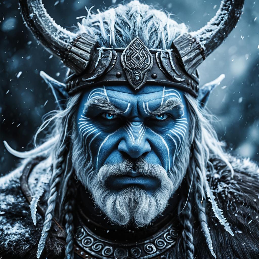 Male prehistoric Viking alien creature portrait with a cold frost effect and icy shamanic struggle atmosphere. The creature has frost blue skin, ancient runic face paint, frozen stare, depicted with high detail to evoke a demigod quality.