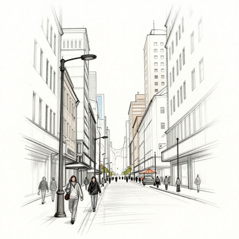 Turn photo into sketch outline artistic representation of a bustling city street, featuring tall buildings, pedestrians, and streetlights with minimalist yet expressive pencil strokes, emphasizing contours and lines over colors for a dynamic urban vibe.