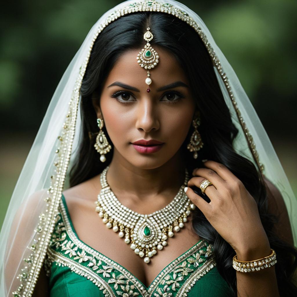 Beautiful indian bridal ,1girl, jewelry, solo, bracelet, ring, earrings, realistic, black hair, necklace, dark-skinned female, dark skin, blurry background, looking at viewer, long hair, lips, blurry, dress, green dress, veil