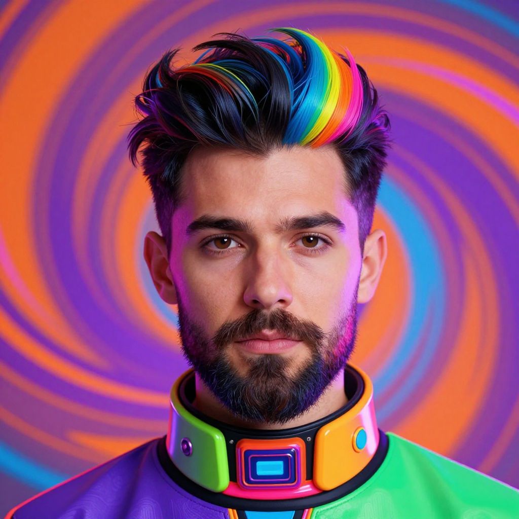 A vivid, digital portrait of a handsome man with a well-groomed beard and mustache, featuring bright, neon colors. His dark hair is styled with a flowing, swirling pattern resembling a rainbow. The background is a dynamic swirl of orange, purple, and blue. He wears a high-tech, colorful collar that matches the background's hues. The image has a futuristic, almost cyberpunk vibe.