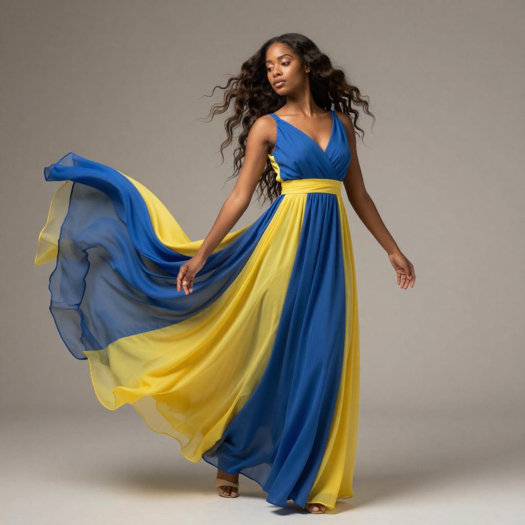 A dark-skinned woman wearing a sleeveless flowing gown with panels of blue and yellow fabric. The dress extends into swirling ribbons that create a dynamic and elegant effect. She has long, wavy hair and is posed against a soft gradient background, wearing open-toed sandals.