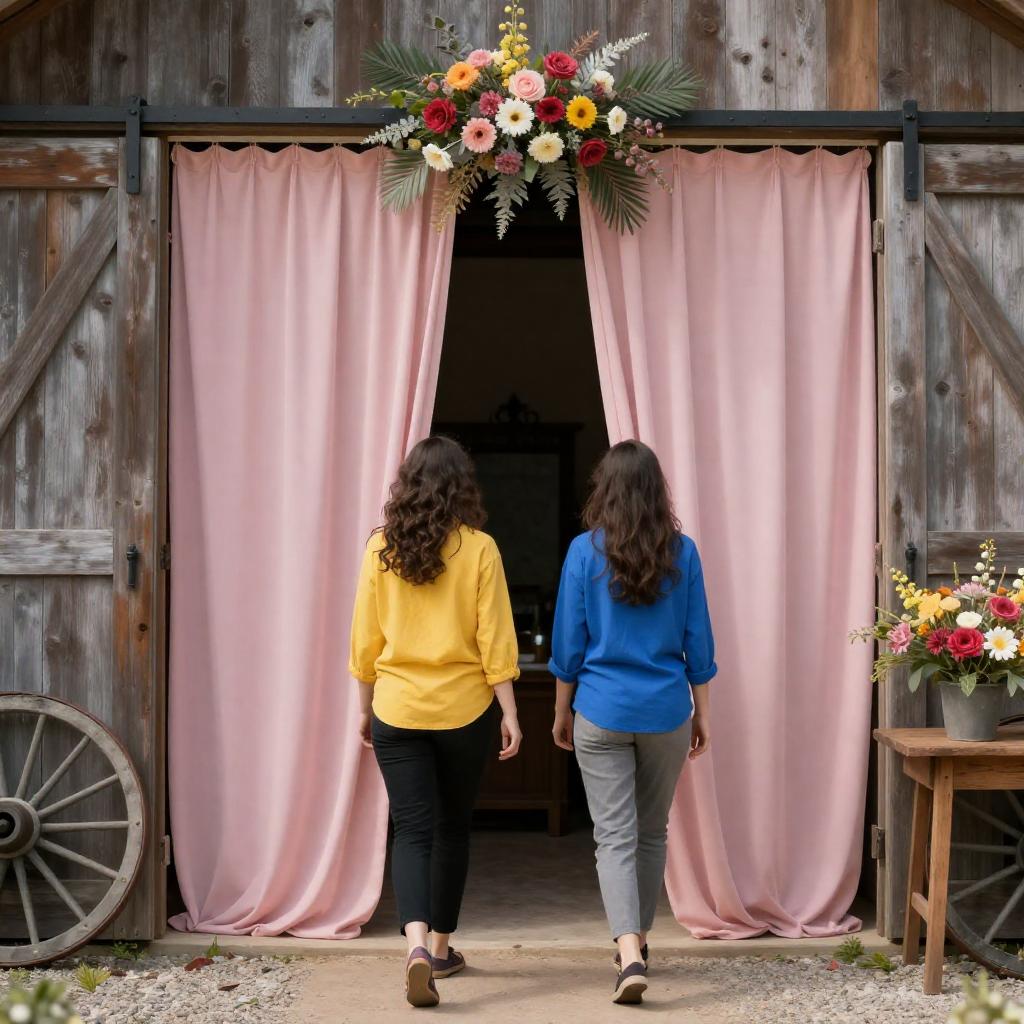 Photograph of two women walking through pink, floor-length curtains hanging over a rustic wooden barn door. The woman on the left wears a yellow shirt and black pants, the woman on the right wears a blue shirt and gray pants. Above the curtains, a large floral arrangement. To the right, a wooden table with colorful flowers. Two wagon wheels on either side of the door. Gravel ground.