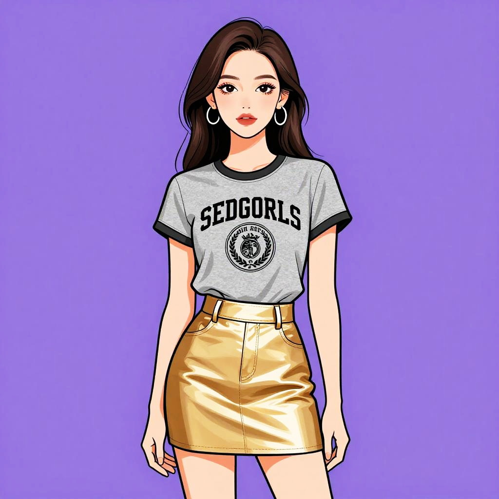 Woman with pretty face and pretty hair. Woman, trendy fashion, graphic t-shirt with short sleeves and crew neck, slogan and emblem in black on a heather grey background, metallic gold mini skirt with high waist, straight fit. --sref 1467