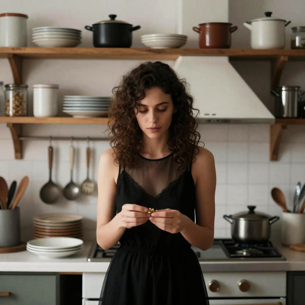 Woman with curly brown hair in black sheer dress holding small object, standing in cluttered vintage kitchen. Shelves with dishes, pots, canisters, hanging utensils, and white wall-mounted appliance in background. Soft light, neutral colors. Woman's expression is focused.