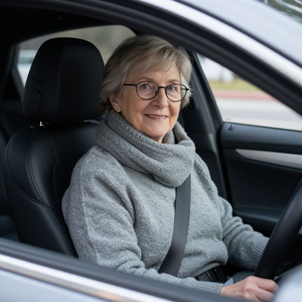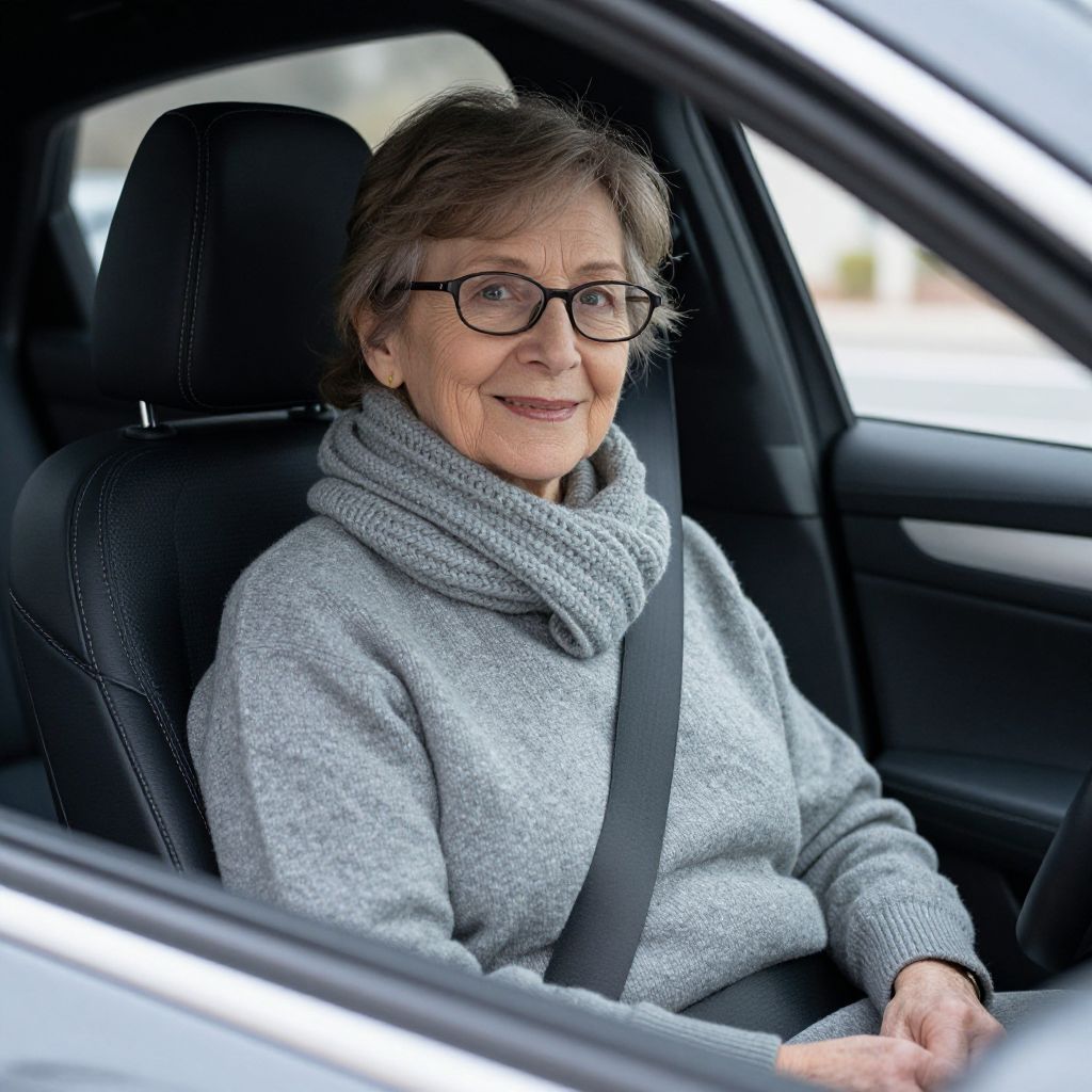 Elderly woman seated comfortably in the passenger seat of a modern car, wearing a cozy gray scarf and glasses, smiling warmly while secured by a black seatbelt.