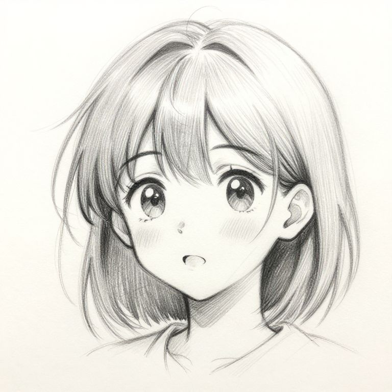 Face sketch anime inspired artwork, energetic young girl with playful expression, intricate pencil strokes creating depth in hair and eyes, subtle gradients shading cheekbones, faint sketch marks suggesting movement, minimalist use of color highlights