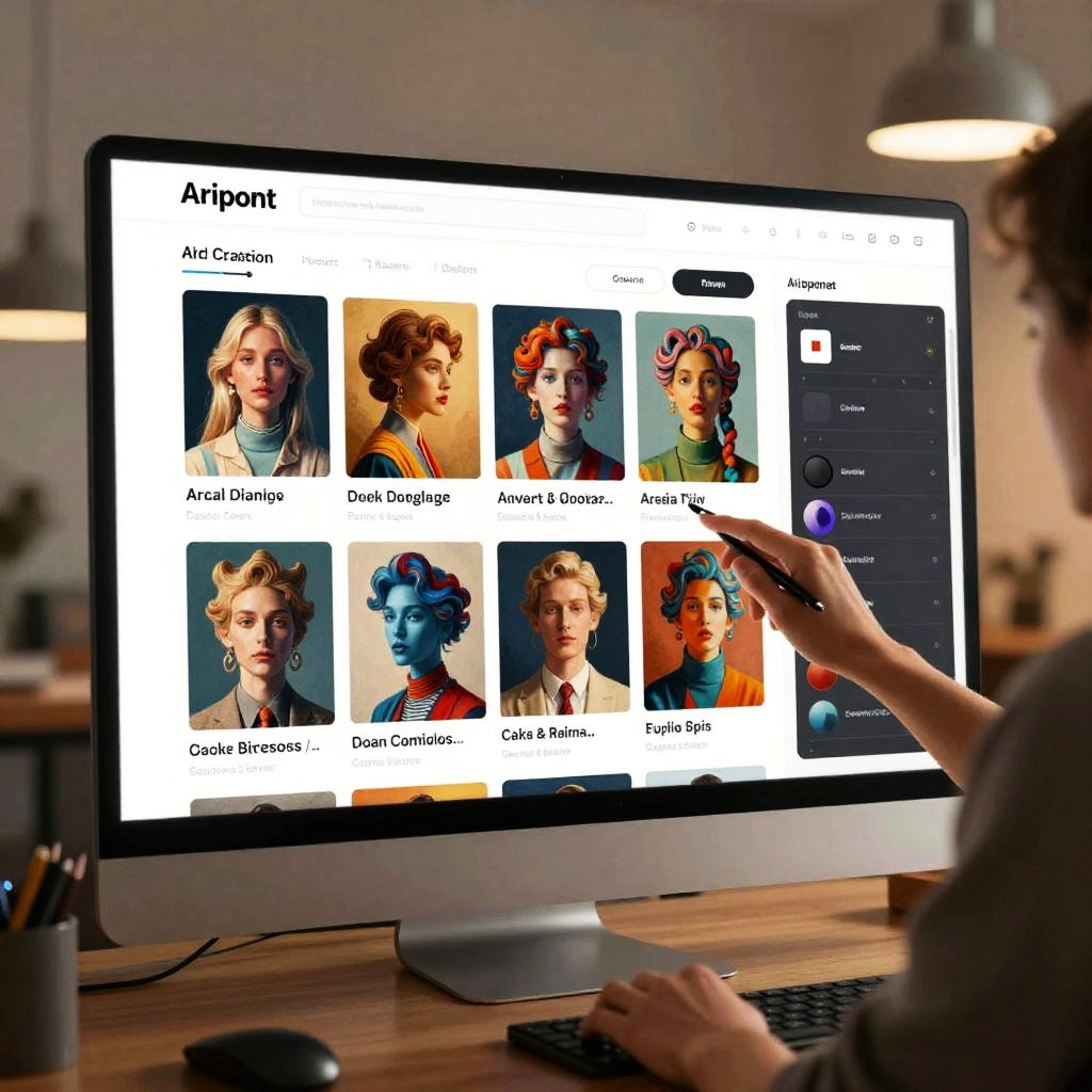 AI art generator website free, creative dashboard view with AI-generated surreal art previews, side panels showing filter options and style presets, a user selecting art styles on a sleek touchscreen, modern and engaging UI, warm ambient lighting, high-tech workspace