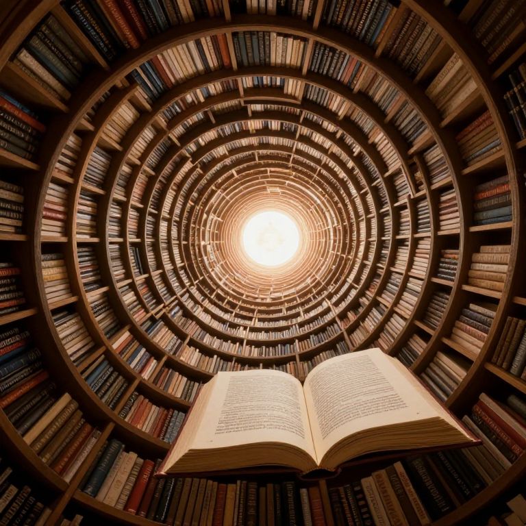 An endless vortex of knowledge beckons, its spiraling shelves whispering secrets of eternity while an open book at its center hums with the paradoxical promise of infinite wisdom and the void of unknowing.