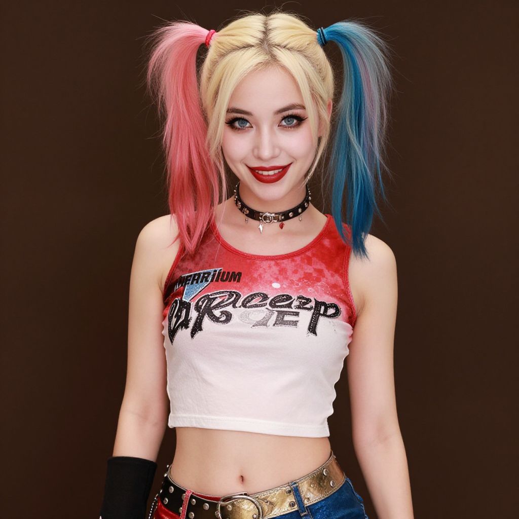 "premium harley quinn, 1girl, solo, twintails, makeup, multicolored hair, realistic, pink hair, breasts, lipstick, belt, looking at viewer, blonde hair, smile, red lips Realistic photo of casual sexy person with pretty face"