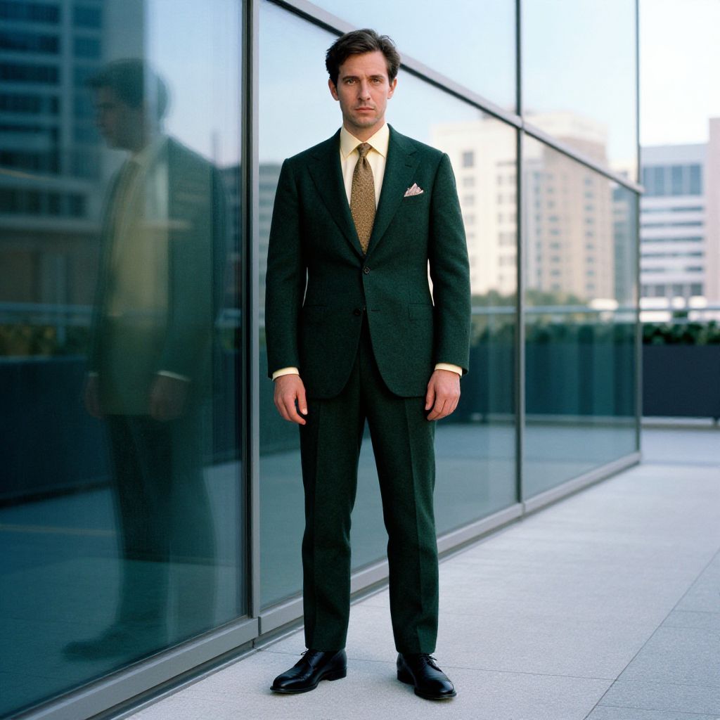 A man, dark green wool suit, cream dress shirt, textured silk tie, black leather derby shoes, elegant pocket square, modern glass façade, sleek lines, vibrant city skyline, 3M analog film stock, confident expression Man has masculine face and piercing eyes