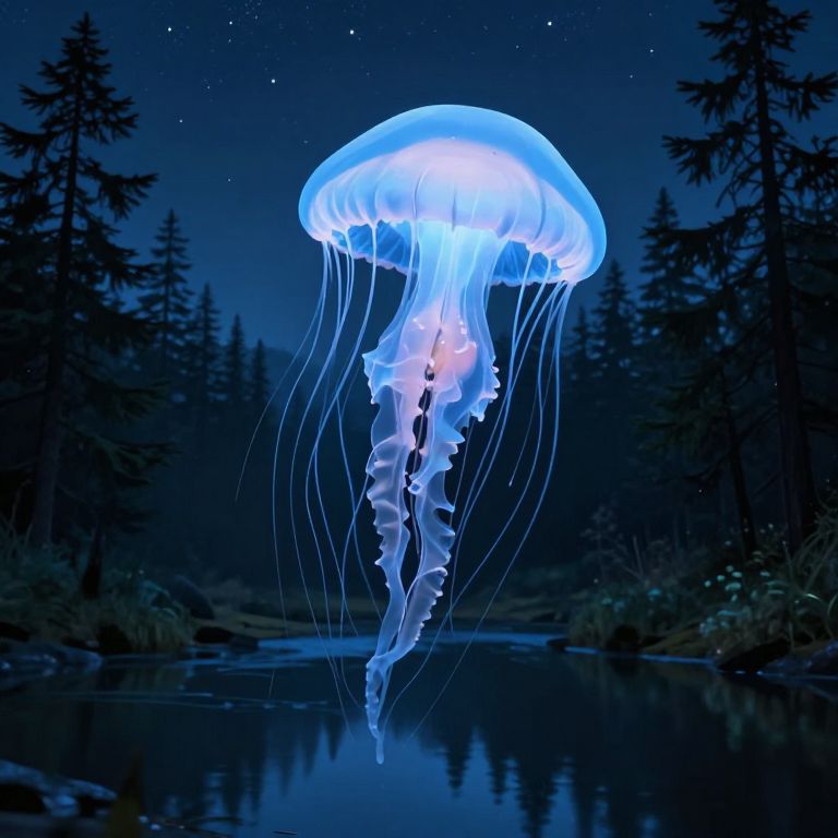 Photograph of a glowing blue jellyfish with translucent tentacles floating in a dark, starry forest lake at night.