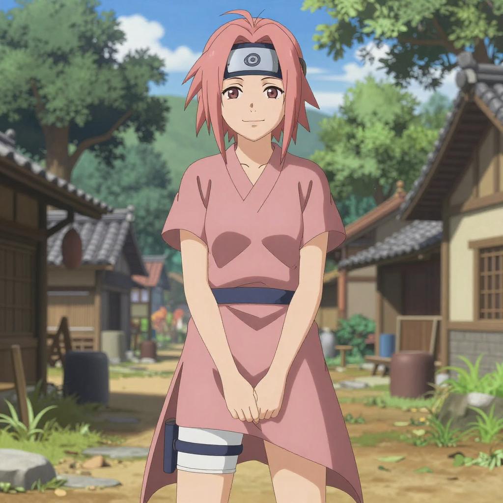 This is a digital anime-style drawing of a young woman with pink, shoulder-length hair and brown eyes. She wears a pink, short-sleeved, V-neck kimono-style top with a black headband featuring a white symbol, and white and black thigh wraps. She stands in a sunlit, rustic village with traditional wooden houses, trees, and a clear blue sky in the background. Her hands are clasped in front of her, and she has a gentle, slightly shy smile. The image has vibrant colors and detailed shading, typical of anime art.