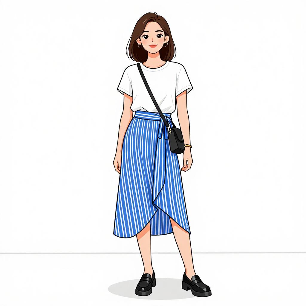 Woman with pretty face and pretty hair. smiling Woman, casual chic, white crew neck t-shirt, tucked into a high-waisted midi skirt with vertical stripes in varying shades of blue and white, asymmetric wrap-style hem, black crossbody bag with a slim strap, black platform loafers with a round toe, minimal jewelry with a thin bracelet, studio background with a solid white floor and wall. --sref 1467