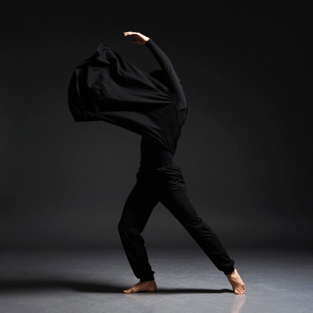 Dynamic action shot of a dancer mid-motion wearing sleek black trousers, captured in a studio with dramatic spotlight and dark background, emphasizing flow and movement of fabric, contemporary dancewear style, high contrast, minimalistic.