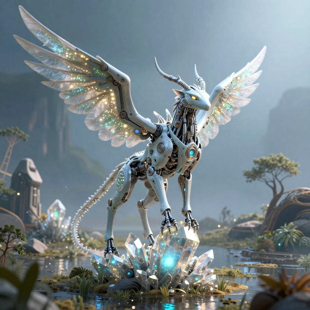 AI generated animal hybrid with mechanical wings and bioluminescent patterns, perched on a glowing crystal in a sci-fi landscape, intricate technological elements fused with nature, surreal composition, soft glowing light, ultra detailed digital illustration