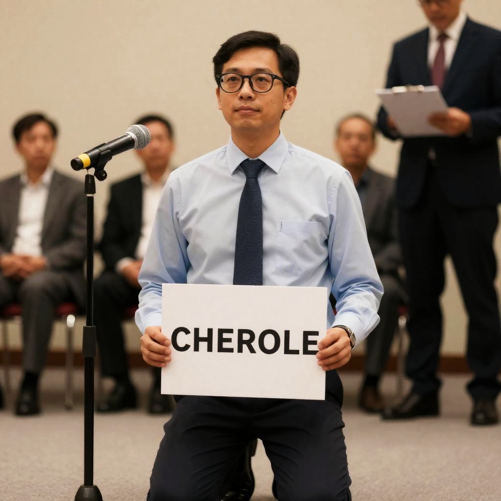 Photograph of a man with glasses, light blue shirt, and dark tie, holding a sign, kneeling in front of a large microphone. Background has blurred people, some wearing suits, seated. Another man with a clipboard stands to the right. Warm indoor lighting.