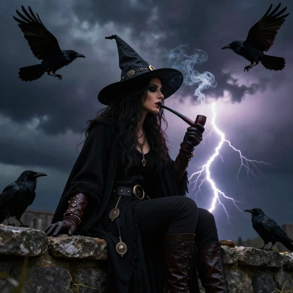 Witch smoking a curved pipe while perched on a stone wall under a stormy sky, lightning illuminating her silhouette, raven companions circling overhead, detailed textures on her leather gloves and mystical amulets, intense and moody fantasy scene.