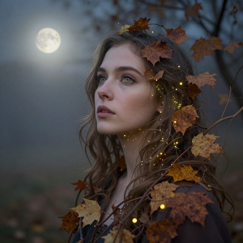 Photograph of a young Caucasian woman with fair skin and long, wavy brown hair adorned with autumn leaves and tiny, glowing fairy lights. She has striking green eyes and a contemplative expression, gazing into the distance. The background is a misty, moonlit night with a bright, full moon partially obscured by trees. Her attire is dark, blending into the twilight atmosphere. The image has a magical, ethereal quality, enhanced by the soft, glowing lights and the contrast between her delicate features and the dark, moody background.