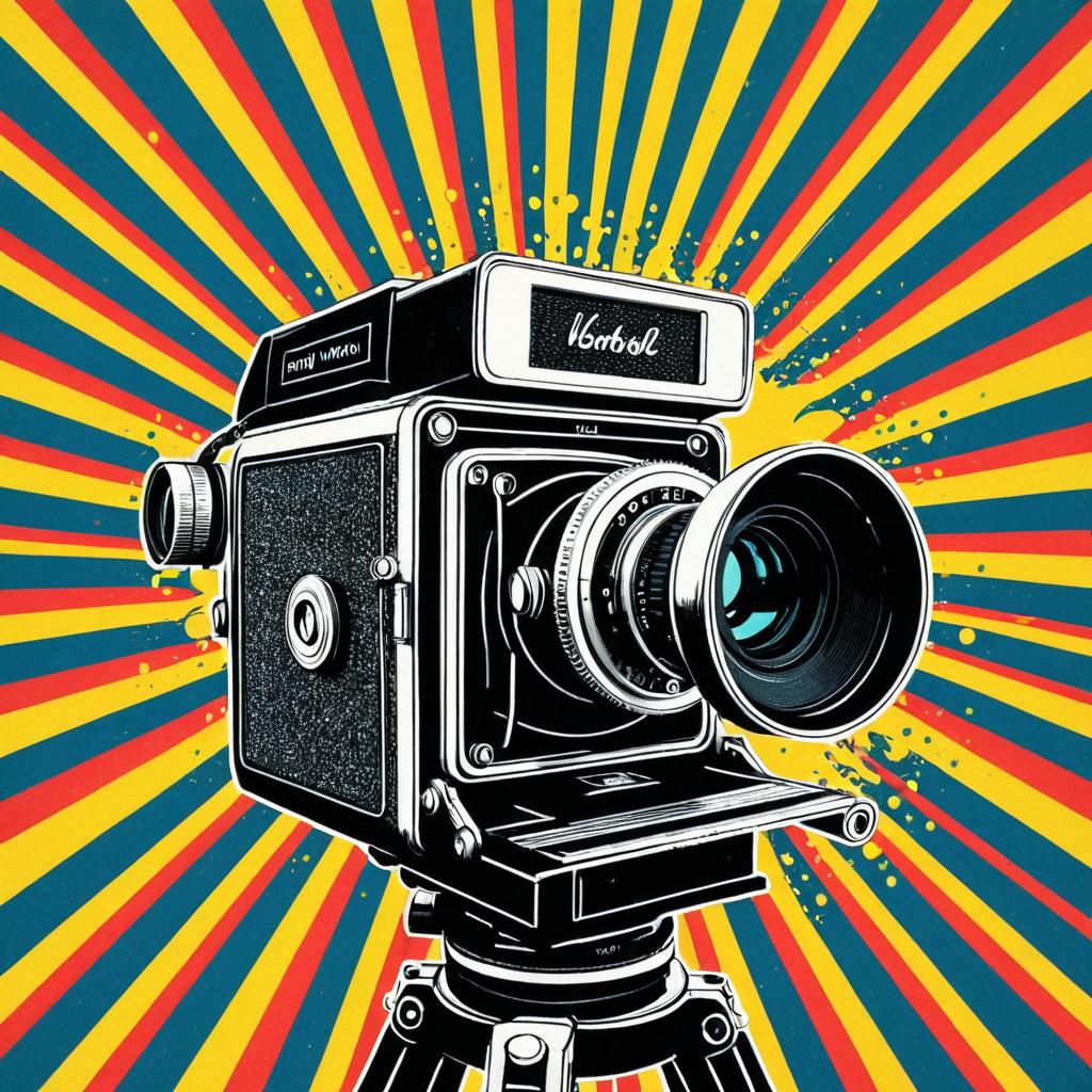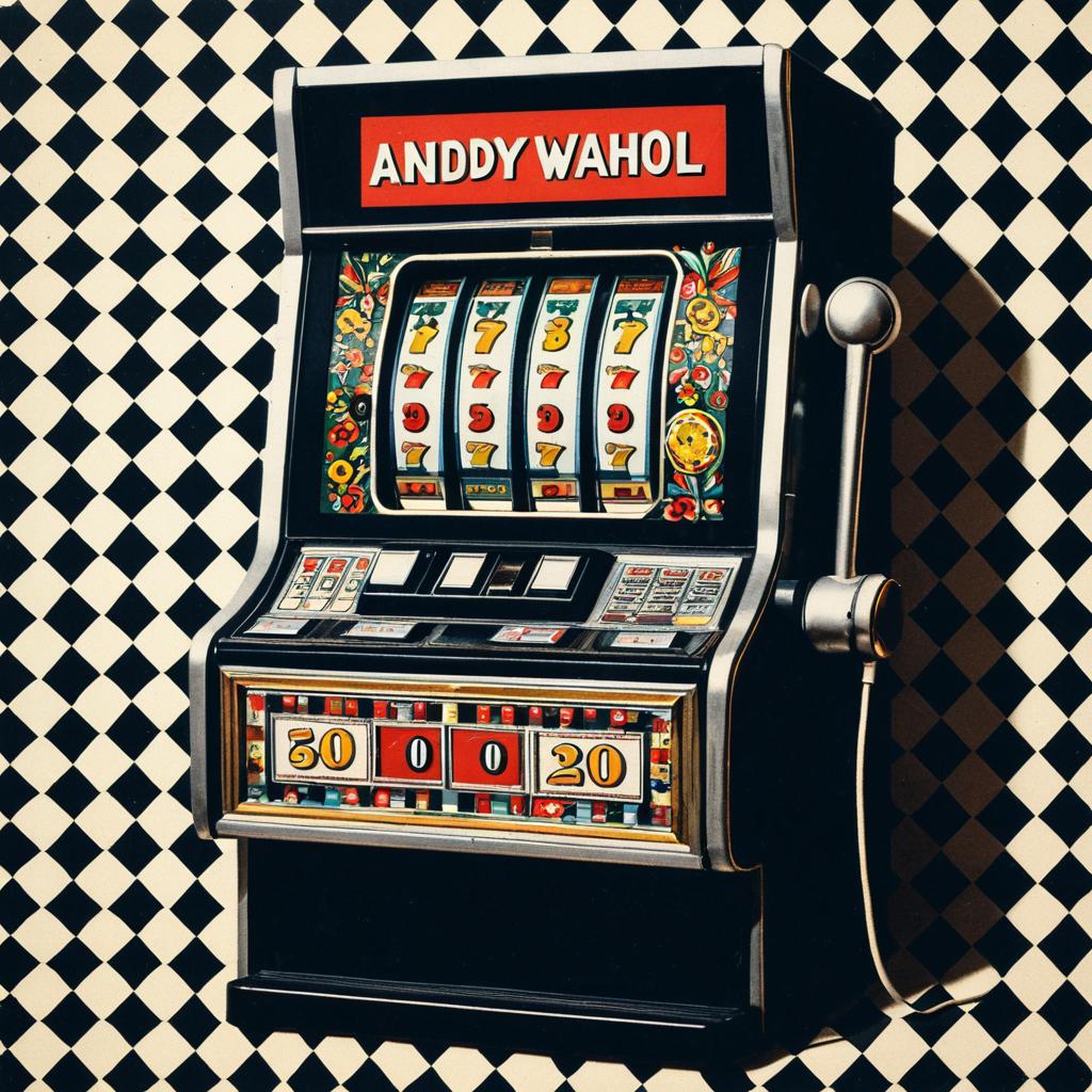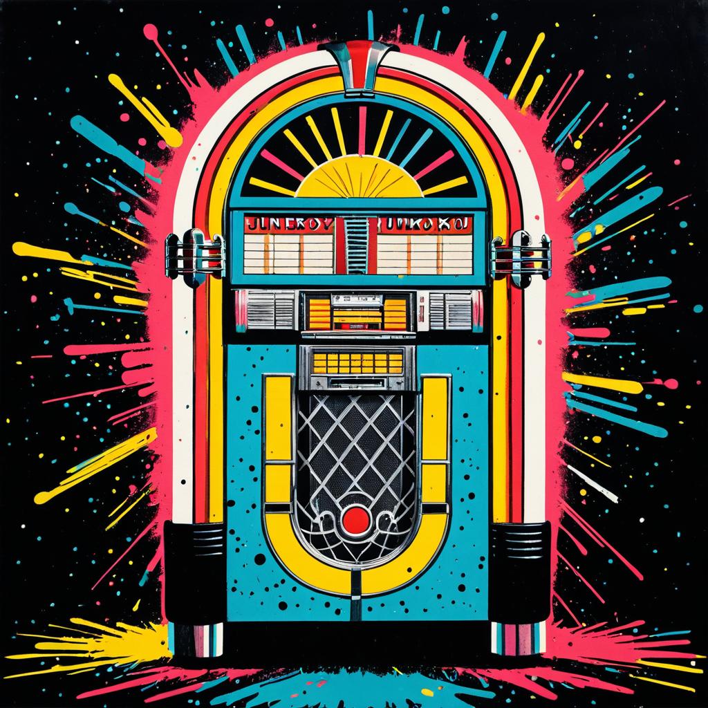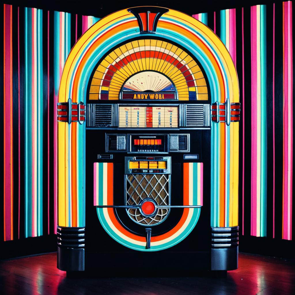 Colorful artwork depicting a vintage jukebox in the style of Andy Warhol, set against a vibrant psychedelic swirl background with bright contrasting yellow, red, pink, and blue hues.