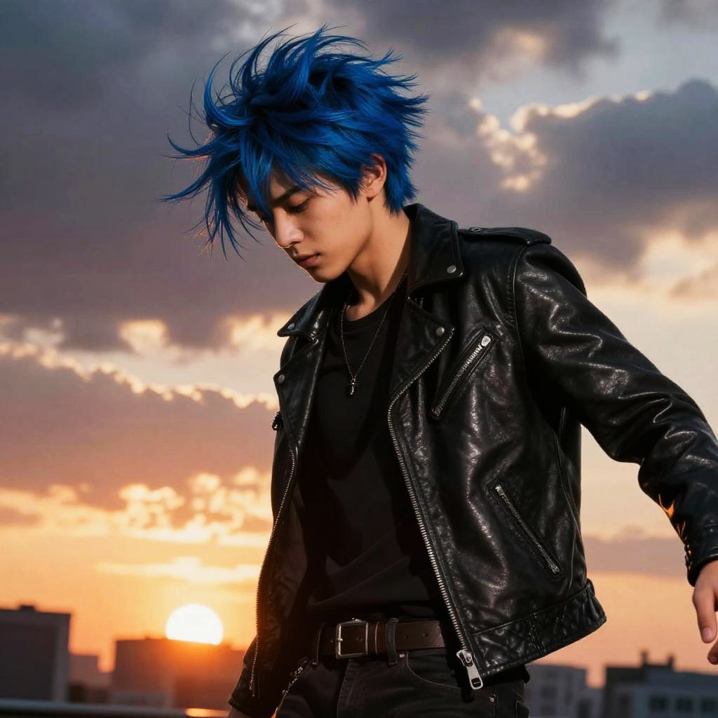 Dynamic action scene with boy sporting blue hair, wind-blown spiky style, wearing a leather jacket, dramatic sunset skyline, cinematic lighting, high contrast