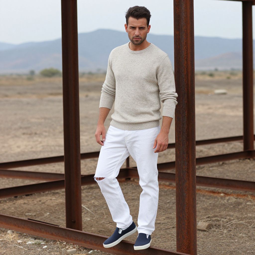 Photograph of a young man with short, dark hair and a trimmed beard, standing outdoors near abandoned railway tracks. He wears a light beige, knitted sweater and white, slightly loose-fitting pants with a small black logo on the left thigh. He completes the outfit with dark blue, low-top sneakers with white soles. The background features a desolate, arid landscape with distant mountains under an overcast sky. Rusty metal beams frame the scene, adding a rugged, industrial touch. The man's stance is relaxed, with one hand slightly raised and a neutral expression on his face.