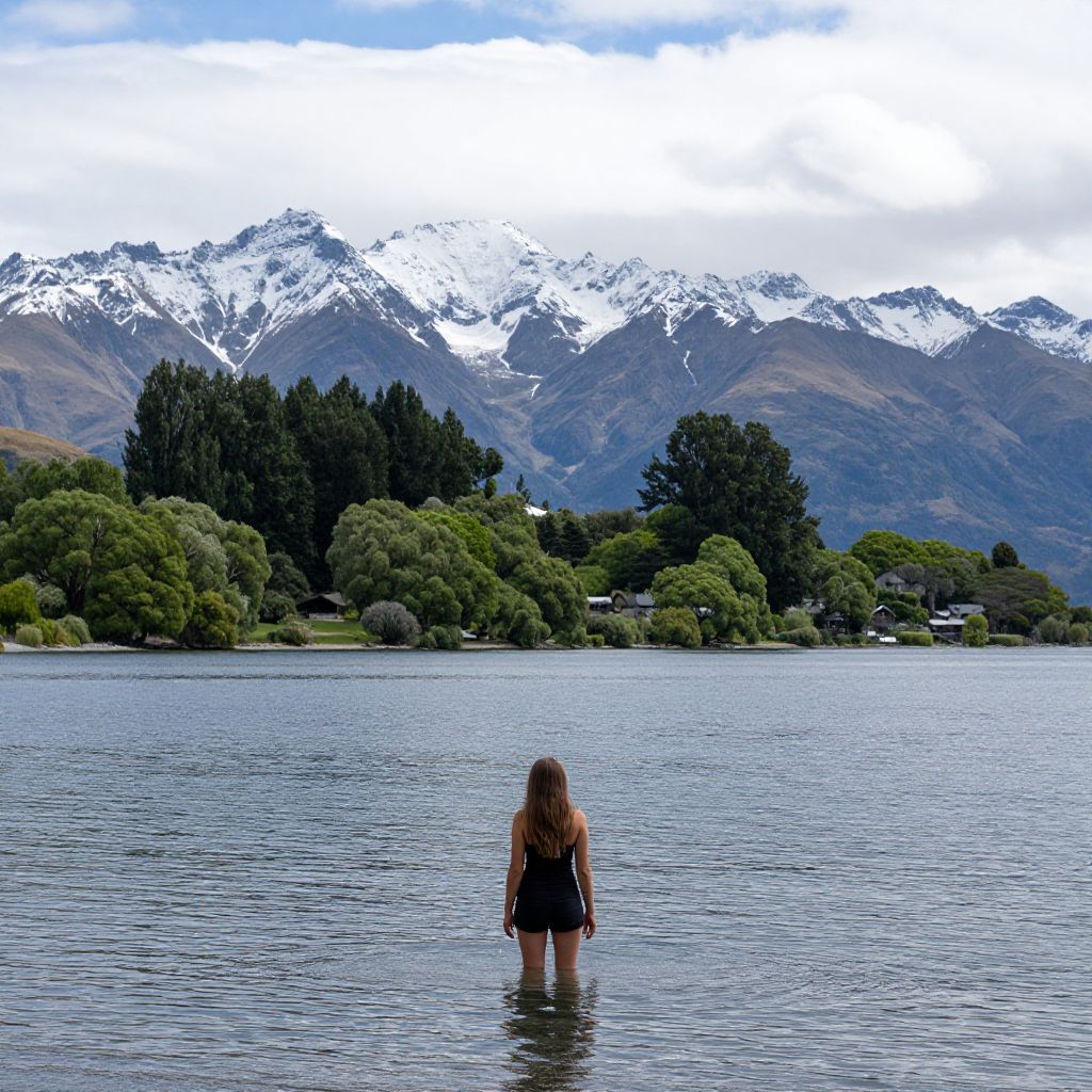 A woman stands waist-deep in the tranquil waters of Lake Wanaka, framed by majestic snow-capped mountains and lush green forests under a partly cloudy sky.