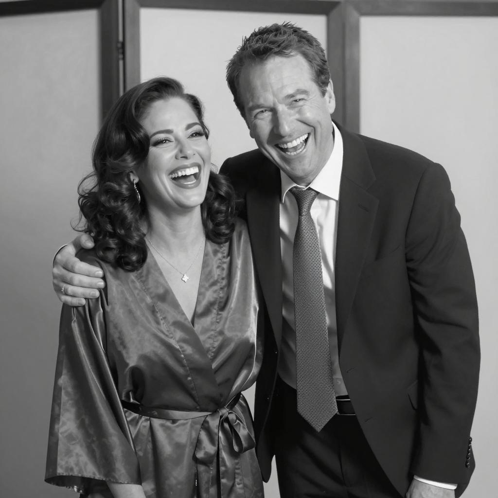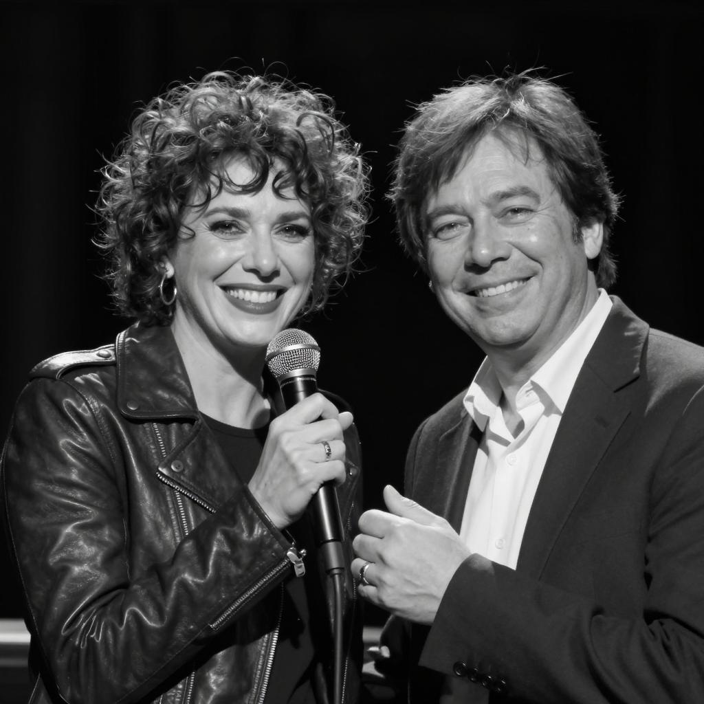 Black and white photograph of two people singing passionately. Man on left, dark suit, pointing finger, smiling broadly. Woman on right, light-colored dress, curly hair, mouth open, singing. Dark background. Intense expressions, close-up shot.