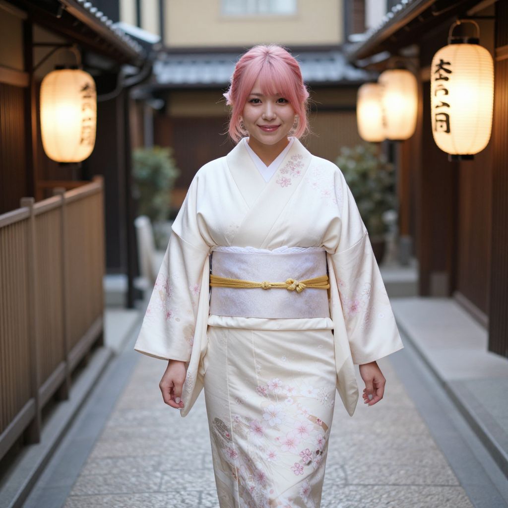 A modern-day Japanese woman in her 30s with soft pink hair and a kind smile, dressed in a stylish modern fusion of Japanese traditional costume — a pale ivory kimono with a subtle pattern of cherry blossoms, paired with a minimalist white obi — walking through a Kyoto-style alleyway with paper lanterns and wooden fences, the background features traditional architecture and warm evening light.. The woman has big breasts and cute face