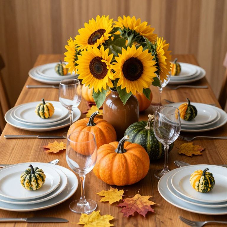 Autumnal table setting showcases a vibrant centerpiece of sunflowers in a brown vase, surrounded by orange and green pumpkins, complemented by four place settings featuring layered plates, wine glasses, and small decorative gourds, all set against a backdrop of warm wooden tones and scattered fall leaves.