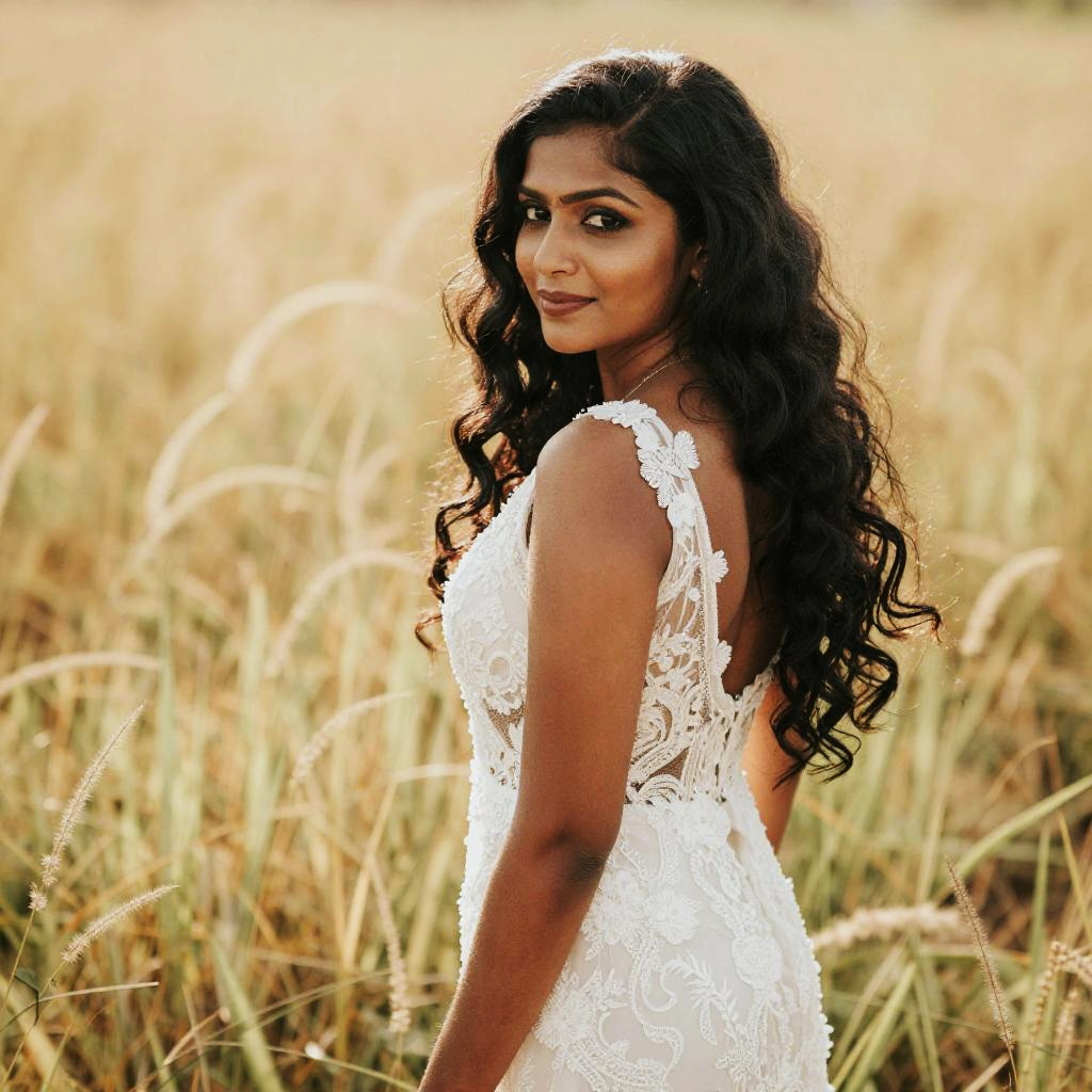 Photograph of a beautiful Indian woman with long wavy black hair, wearing a white lace sleeveless wedding dress, standing in a golden wheat field,