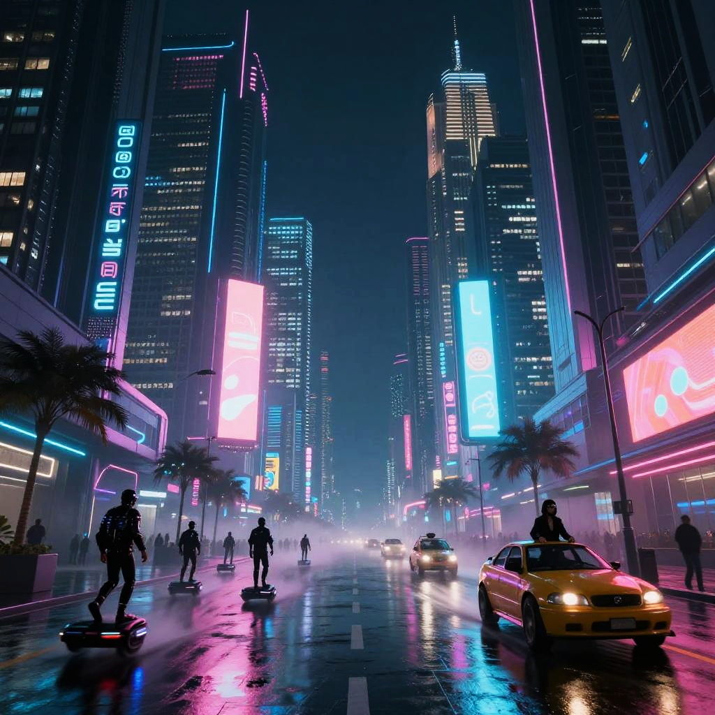 This digital artwork depicts a futuristic, neon-lit cityscape at night. A central skyscraper dominates the scene with a massive, brightly lit holographic display of a dancing figure in vibrant pink, blue, and purple hues. Surrounding buildings also feature glowing advertisements and lights in similar neon colors. Three hovering drone-like vehicles are suspended mid-air around the central skyscraper. The street below reflects the colorful lights, with silhouetted pedestrians walking towards the building. The overall atmosphere is cyberpunk, with a focus on modern technology and vivid, artificial lighting. The image combines elements of sci-fi and urban landscapes, creating a dynamic, energetic scene.