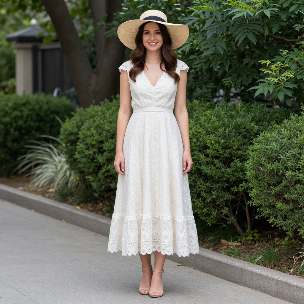 Photograph of a smiling woman with long brown hair, wearing a white lace dress, wide-brimmed hat, and nude heels, standing on a