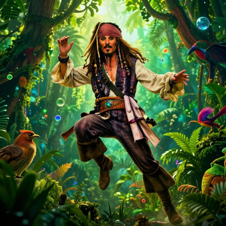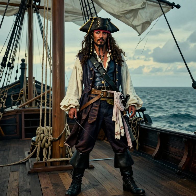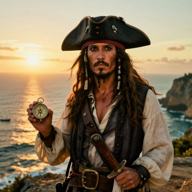Jack Sparrow Gemini prompt: A swashbuckling pirate with a mischievous grin, wearing a glittering one-piece suit and a golden compass pendant, standing on a stormy Caribbean island at twilight, with stars shining above and a mysterious gemstone glowing ominously in his hand. The scene blends pirate lore with celestial elements, surreal and vibrant, in a dramatic, cinematic style reminiscent of MidJourney or DALL-E.