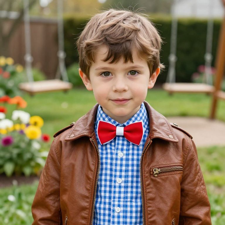 A young boy with soft brown hair, neatly styled and slightly messy at the ends, stands in a sunny backyard. He wears a brown leather jacket with a slightly worn zipper, paired with a blue and white checkered button-up shirt that is neatly tucked in. He fastens a bright red and white bow tie around his neck, adding a touch of playful charm. The boy has a warm, curious expression, looking directly at the camera with bright, wide eyes. The background features a colorful garden with blooming flowers and a wooden swing in the distance, creating a cozy and joyful atmosphere.